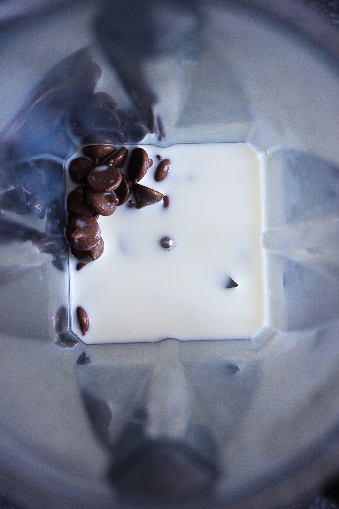 First you will need a high quality chocolate chips ( like to use semi-sweet). Melt them with your full fat milk in the microwave and then whip in the high speed blender.