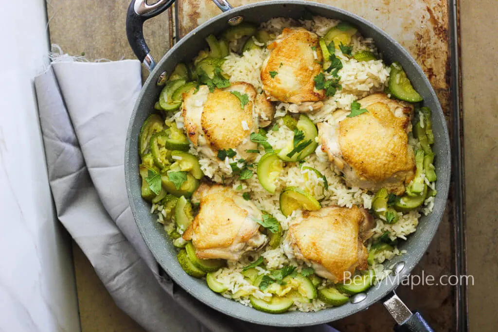 Juicy zucchinis and white rice, delicious chicken thighs… what a perfect combination! Sprinkle with some cilantro and the dinner is ready!